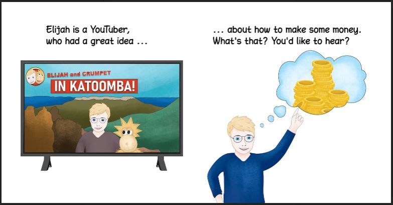 A few issues here: Elijah’s parting needs to be on the other side; coins could do with a $1 added; the Three Sisters rock formation colours need tweaking – then I decided that the YouTube image can be the original thumbnail (Scene 2 has 4 images from our YouTube channel, so it would be too much work getting all of those images right).